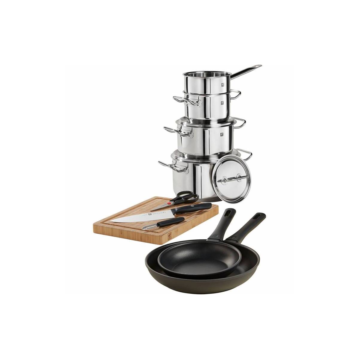 Startovací sada 10 kusů nejzákladnějšího kuchyňského vybavení od Zwilling J.A. Henckels. Sada obsahuje 4 hrnce, 2 pánve, nůž, nůžky, kuchyňské prkénko a škrabku.
